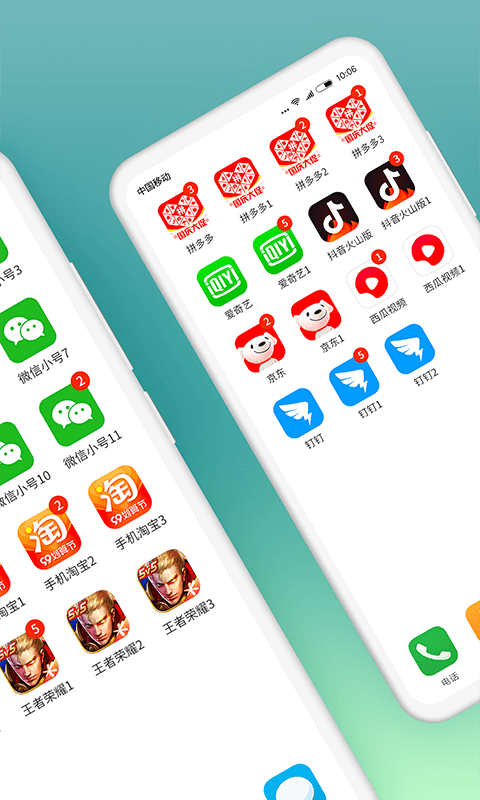 众多微信用户信赖的双开类APP,免费支持社交 软件双开分身,如微信双开、QQ双开;娱乐、游戏应用双开分身,如全民k歌 双开、王者荣耀 双开;购物 、出行 等几乎所有APP的双开分身,解决用户多账户切换烦恼