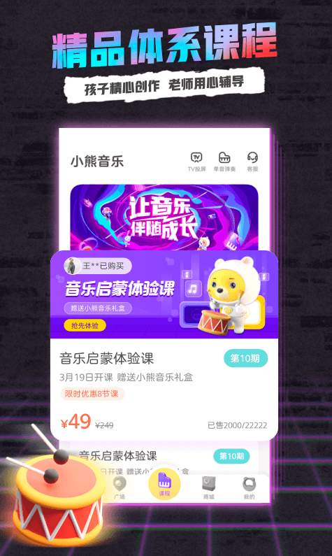 1、小熊音乐可以在线学习,为专为孩子制定的多生态教学可以让孩子沉浸式学习获得不一样的感受