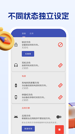1、允许用户根据特定场景如充电、打开应用程序等预设屏幕方向,实现智能管理。