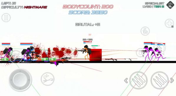 2、玩家控制火柴人进行蹲跳等手段躲避敌人的子弹,使用各种武器击败敌人。