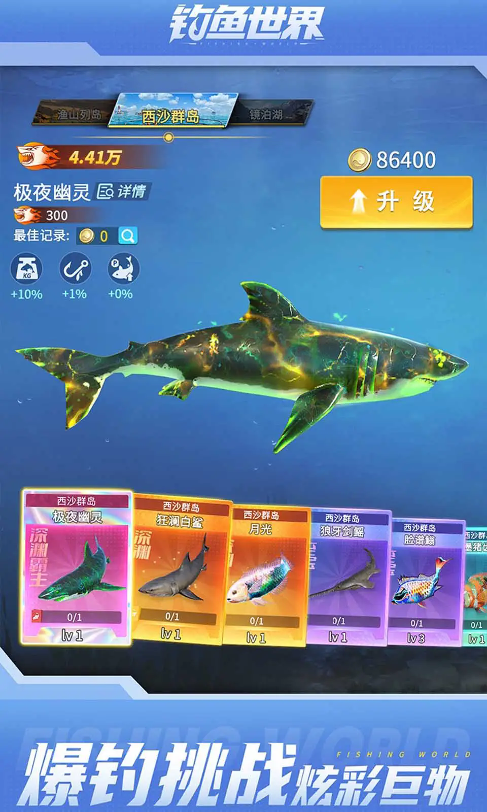 1、超多神秘的鱼类等你来发现,你可以看到凶猛的极夜幽灵,狂澜白鲨,月光,狼牙剑鳐等等不同的鱼类。