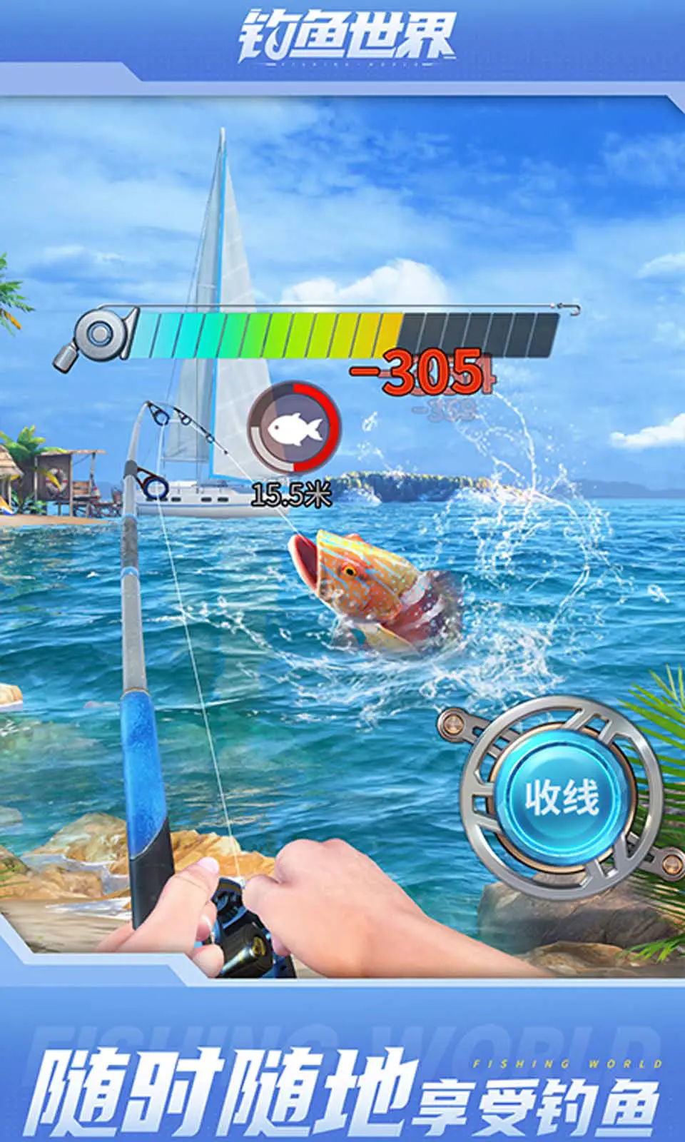 1、游戏对于鱼儿上钩拉杆的模拟做的非常的到位,你需要持续不断的收线放线来耗尽鱼儿的气力。